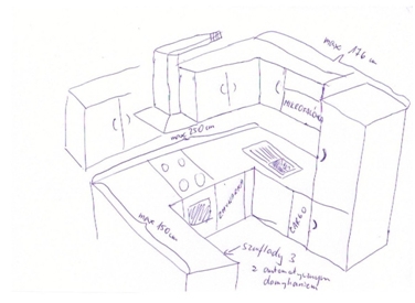 Sending us auxiliary materials for the valuation of furniture, i.e. Sending a project or a construction sketch - it can be a hand-drawn sketch with the marking of doors and windows and the most important water connections, EXAMPLES BELOW. Provide the approximate dimensions of the walls of the building. Determining the style of the kitchen and the type of fronts - the door. Lacquered, embossed MDF, wood, veneer or laminated board, metal fronts, e Specify the type of kitchen countertops, stone or laminated Identification of additional equipment, types of handles, number of drawers, type of drawers, carga baskets, glass, lighting, etc. Types of equipment Defining the equipment of household appliances, free-standing or built-in. If you do not have a project ready for valuation, please provide as much data as possible. In particular: dimensions of the furniture or room projection and information about your expectations. A remote project without access from our side and measurements costs PLN 200 net, it is a cost - refundable deposit at the time of concluding a contract for the implementation of furniture.